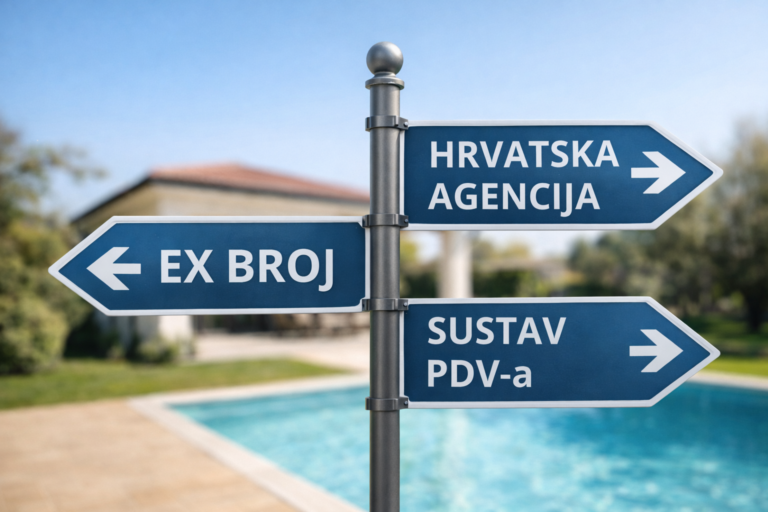 Pregled poreznih opcija za nerezidente koji iznajmljuju u Hrvatskoj, EX broj, rad preko hrvatske agencije ili ulazak u sustav PDV-a, uz objašnjenje kada se PDV plaća, a kada ne.